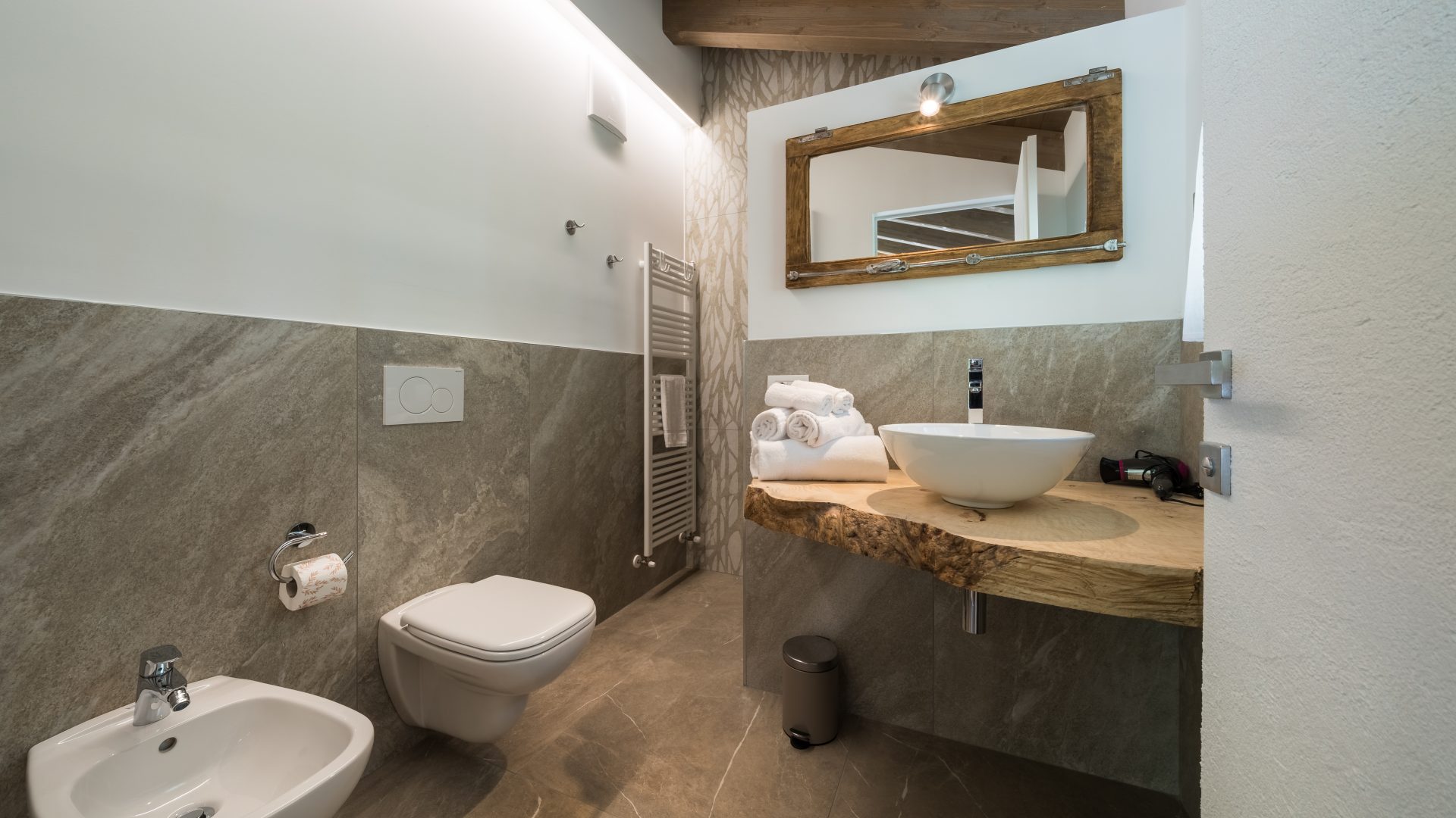 The bathroom with shower includes towels, bathrobes, a hairdryer and a locally made courtesy product.